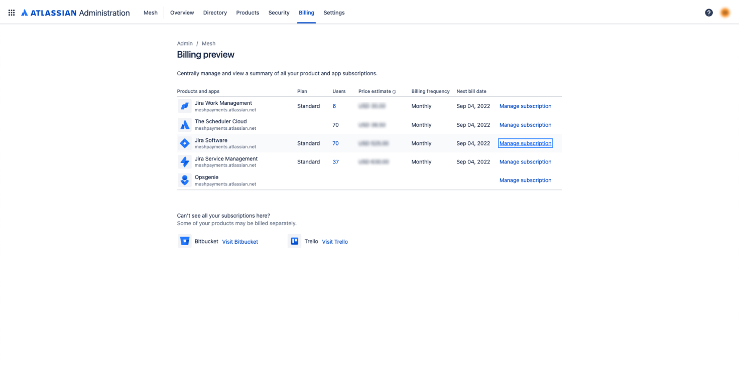 Choose “Billing” from the top bar and click “Manage subscription” next to the Atlassian product whose receipts you’d like to view.